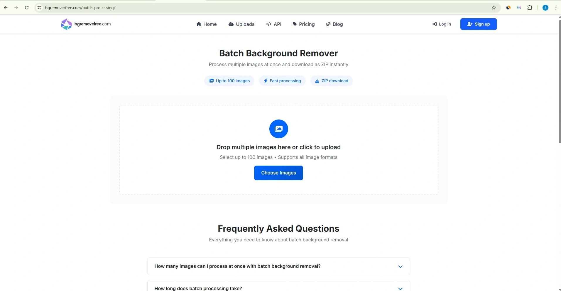 Navigate to bgremoverfree.com/batch-processing . No account is required to get started, though registered users receive priority processing.